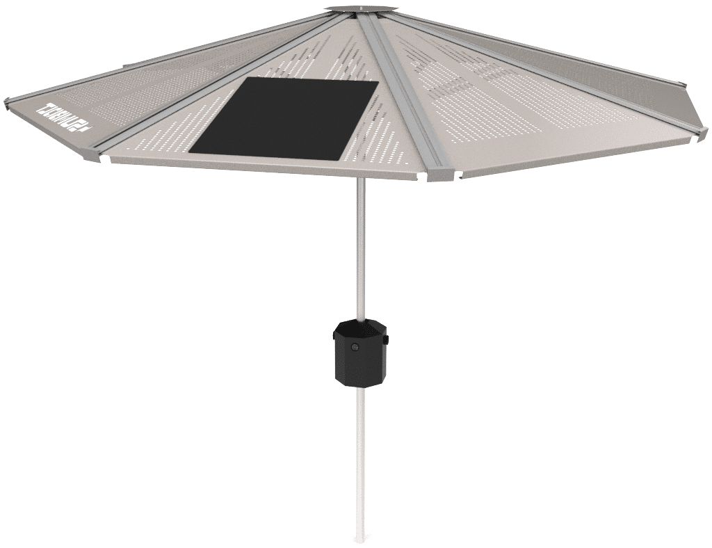 The Eclipse Solar Charging Umbrella will turn any existing table that holds an umbrella into a solar charging station with an aluminum canopy. For our fabric canopy option, click here.